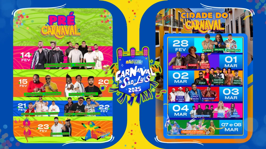 E, finalmente, de 28 de fevereiro a 4 de março, a Cidade do Carnaval te espera! São Luís será palco de um espetáculo inesquecível, repleto de cores, ritmos e uma energia contagiante. O Carnaval de 2025 promete ser o maior e mais animado de todos os tempos. Confira a programação completa do Carnaval da Cidade.